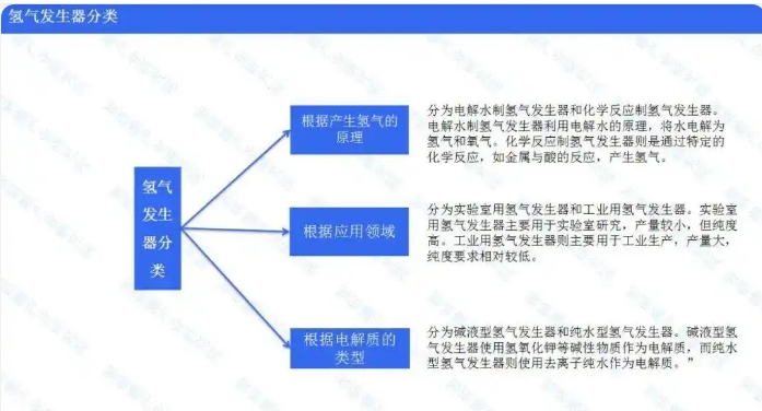 氫氣發(fā)生器根據(jù)產(chǎn)生氫氣的原理,可以分為電解水制氫氣發(fā)生器和化學反應制氫氣發(fā)生器,前者利用電解水的原理將水電解為氫氣和氧氣,后者則通過特定的化學反應如金屬與酸的反應產(chǎn)生氫氣。根據(jù)應用領(lǐng)域可以分為實驗室用氫氣發(fā)生器和工業(yè)用氫氣發(fā)生器,前者主要用于實驗室研究,產(chǎn)量較小但純度高,后者則主要用于工業(yè)生產(chǎn),產(chǎn)量大但純度要求相對較低。此外,根據(jù)電解質(zhì)的類型,電解水制氫氣發(fā)生器又可以分為堿液型氫氣發(fā)生器和純水型氫氣發(fā)生器,前者使用氫氧化鉀等堿性物質(zhì)作為電解質(zhì),后者則使用去離子純水作為電解質(zhì)。