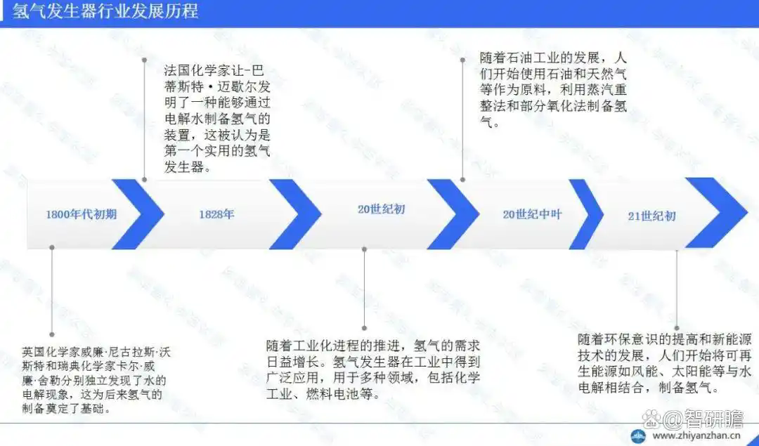 20世紀初隨著工業(yè)化進程的推進,氫氣的需求日益增長。20世紀中葉隨著石油工業(yè)的發(fā)展,人們開始使用石油和天然氣等作為原料,利用蒸汽重整法和部分氧化法制備氫氣。21世紀初隨著環(huán)保意識的提高和新能源技術(shù)的發(fā)展,人們開始將可再生能源如風能、太陽能等與水電解相結(jié)合,制備氫氣。同時,氫氣發(fā)生器也開始應用于人們的日常生活,如用于飲用水的凈化、健康保健等領(lǐng)域。