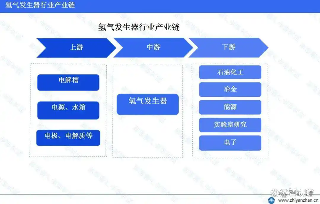氫氣發(fā)生器上游主要包括電解槽、電源、水箱、電極、電解質(zhì)等。其中,電解槽是氫氣發(fā)生器的核心部件,用于電解水產(chǎn)生氫氣和氧氣。電源提供電解所需的電能,水箱則用于儲存水源。電極和電解質(zhì)則是電解過程中的關(guān)鍵材料,直接影響電解效率和產(chǎn)氫純度。氫氣發(fā)生器廣泛應用于各個行業(yè),主要包括石油化工、冶金、能源、電子和實驗室研究等。