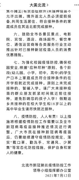 7月12日,廣西桂平市新型冠狀病毒肺炎疫情防控指揮部發(fā)出通告:凡年滿18周歲以上(戶籍不限)且無疫苗禁忌癥的人員均須接種。為強(qiáng)化校園疫情防控,確保校園安全,根據(jù)“應(yīng)種盡種”原則,各個(gè)階段(幼兒園,小學(xué),初中,高中)的學(xué)生戶口本上家庭成員符合接種條件的在開學(xué)前就近完成接種。原則上未完成接種的,暫緩入學(xué)。